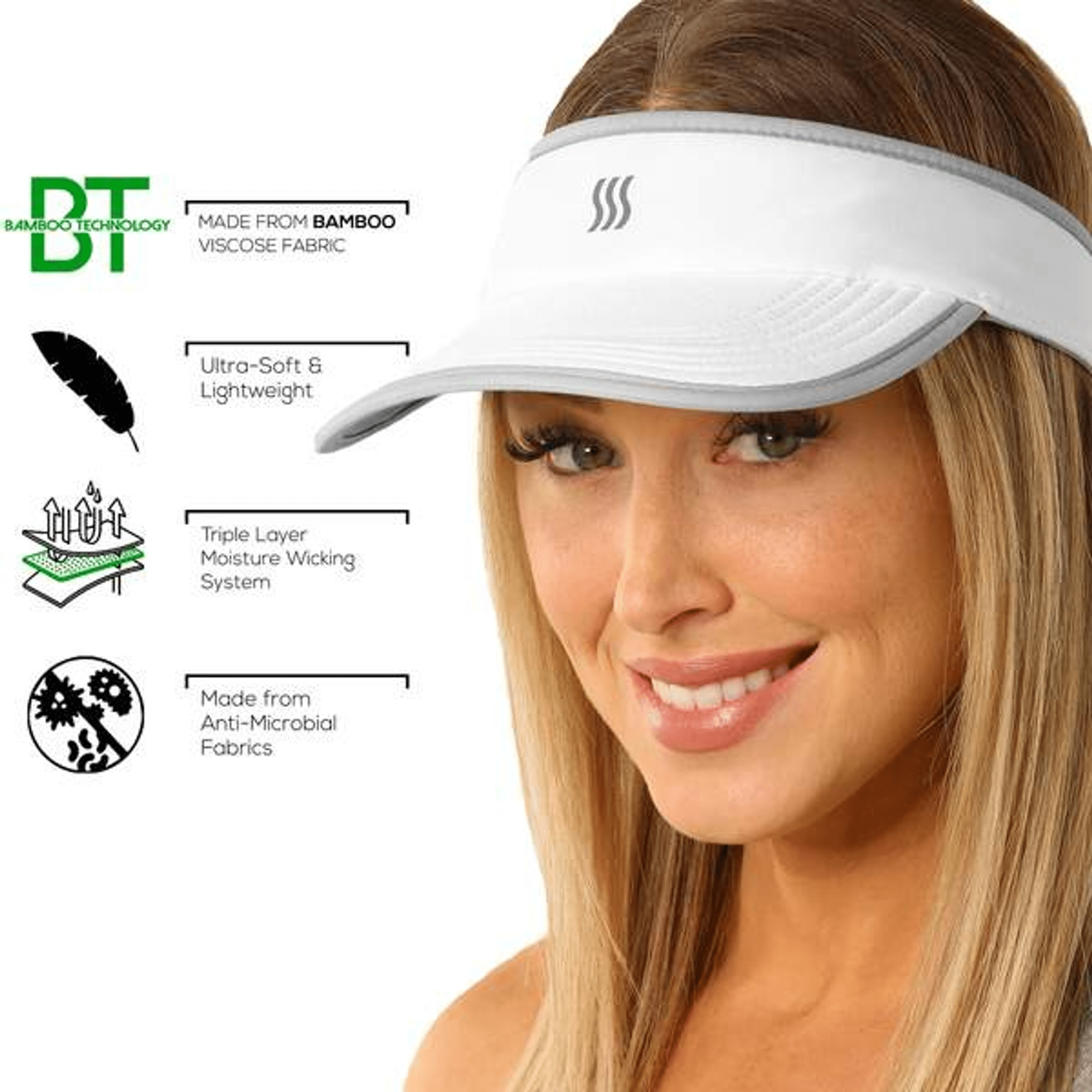 Made with premium fabrics, this running visor is so soft and light you'll forget you're wearing it. No more headaches, no more forehead marks and no more sun in your eyes. Utilizing BAMBOO viscose fabrics, the band of our sport visor is a multi-layer, dynamic system that continuously pulls moisture from your skin THROUGH AND TO THE OUTER LAYER FOR QUICK EVAPORATION to keep sweat out of your eyes.